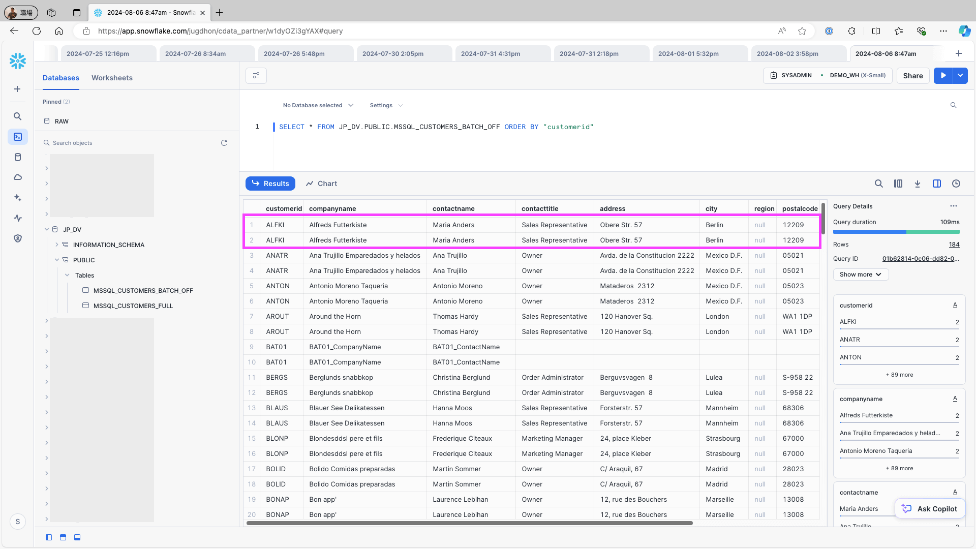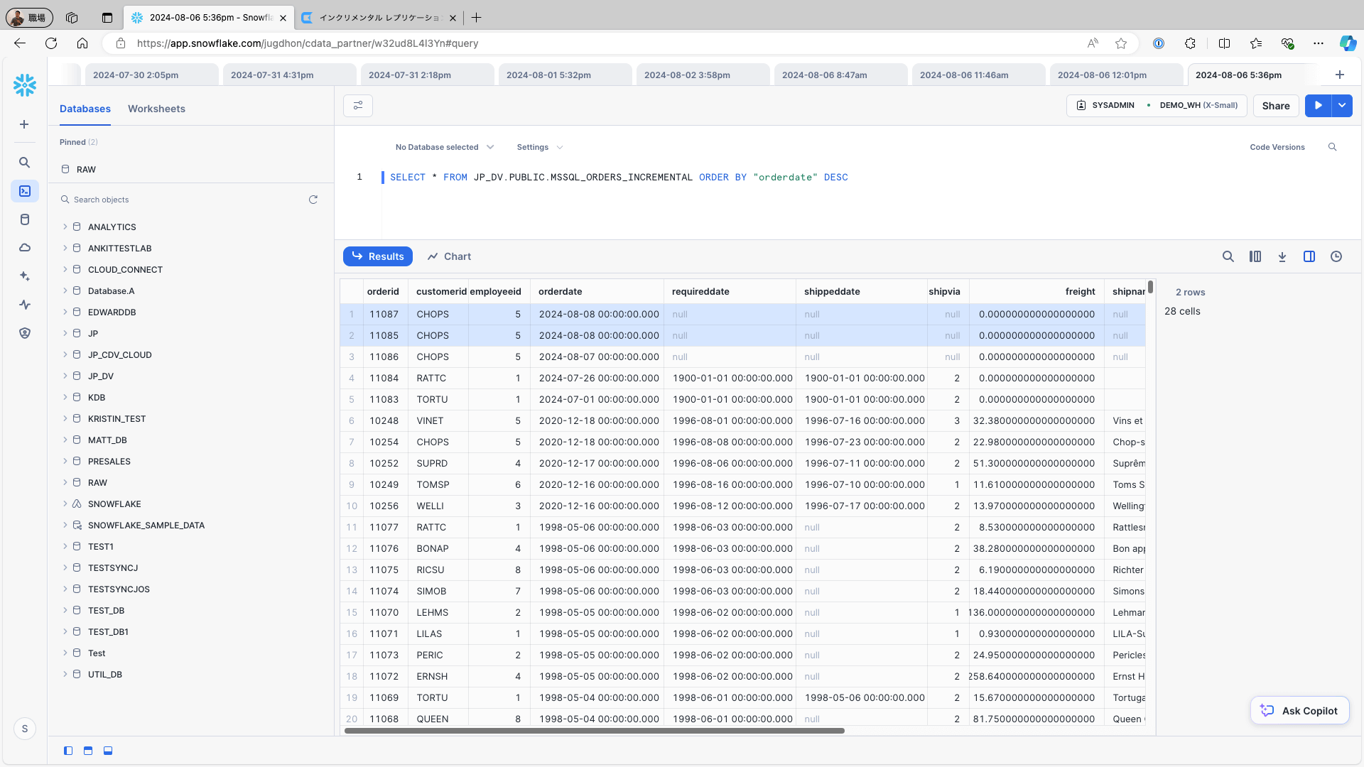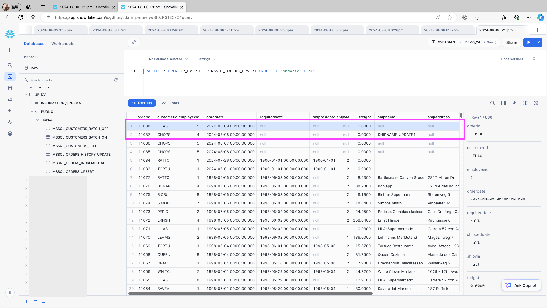 Access Snowflake and check the replication destination table. Confirm that the newly added record and updated on the data source are created as records: