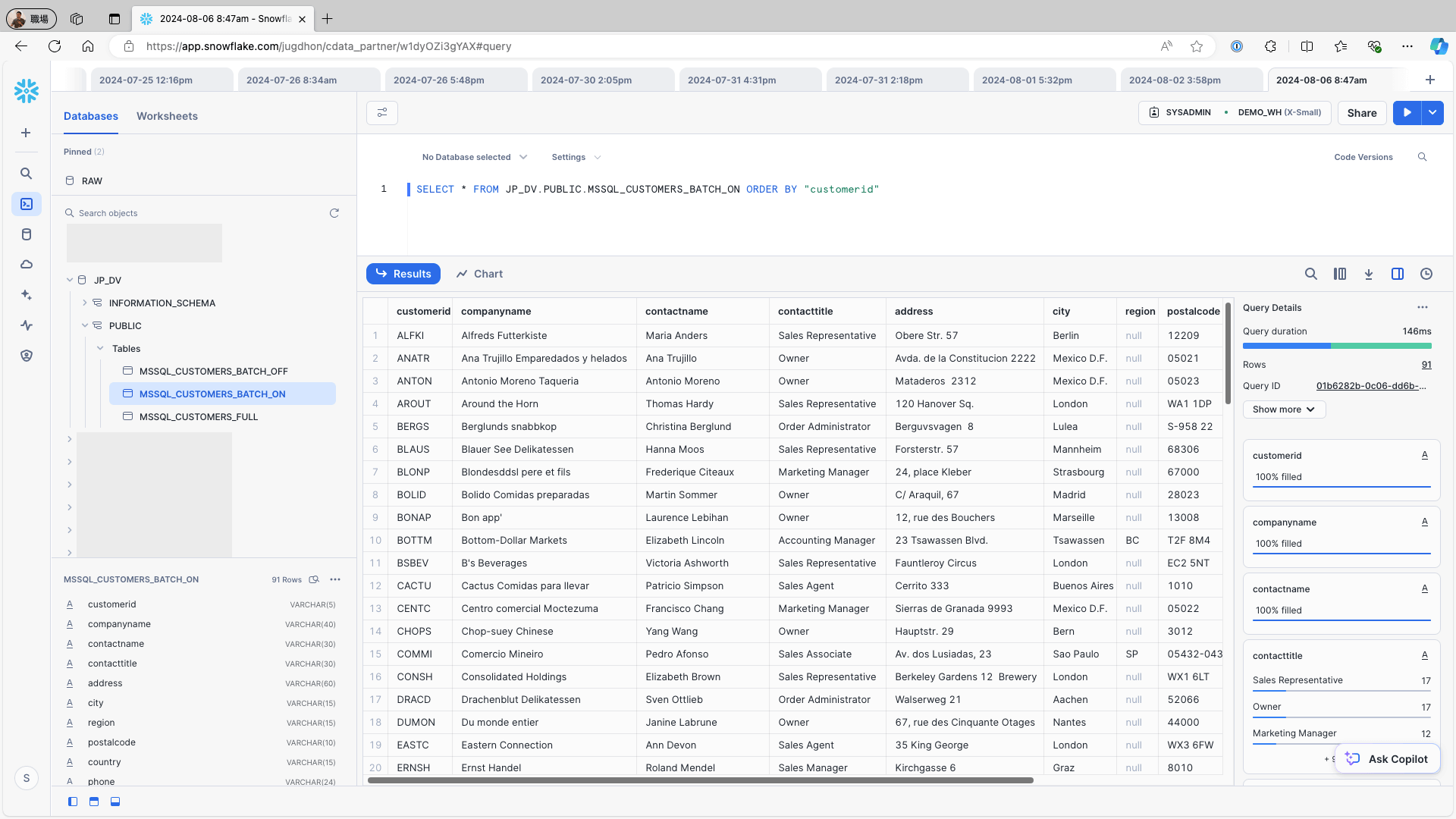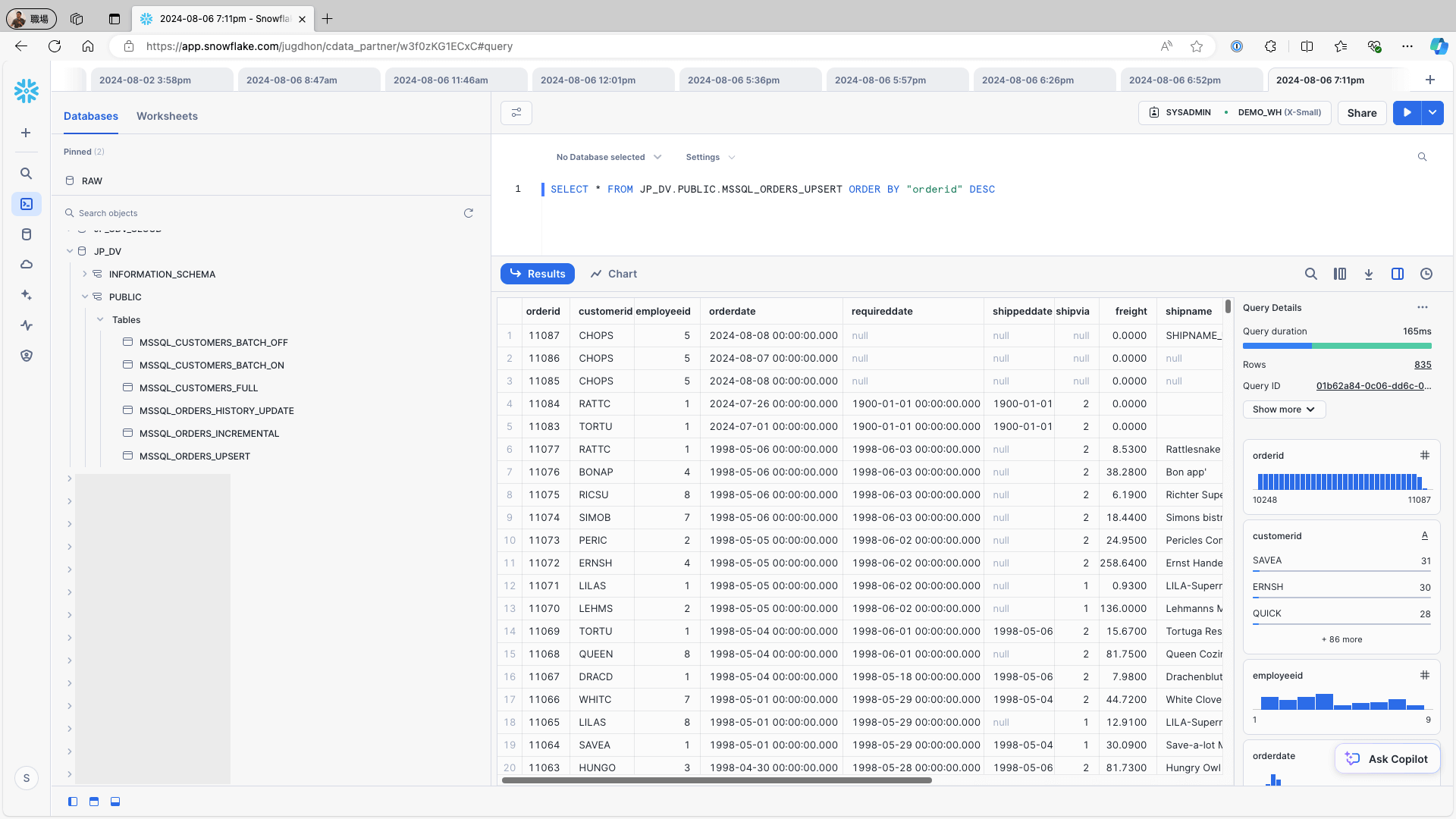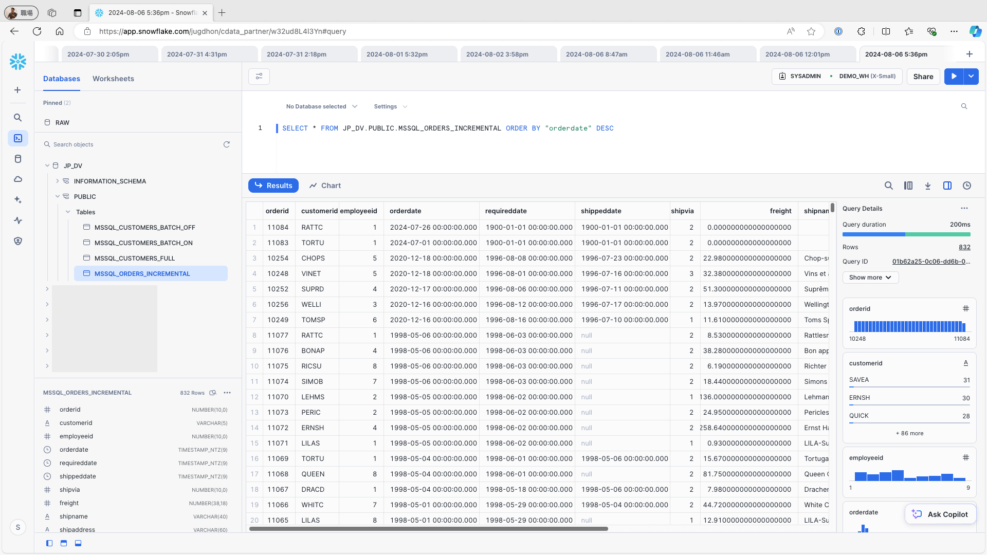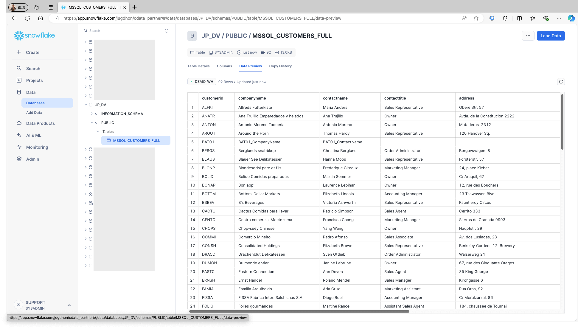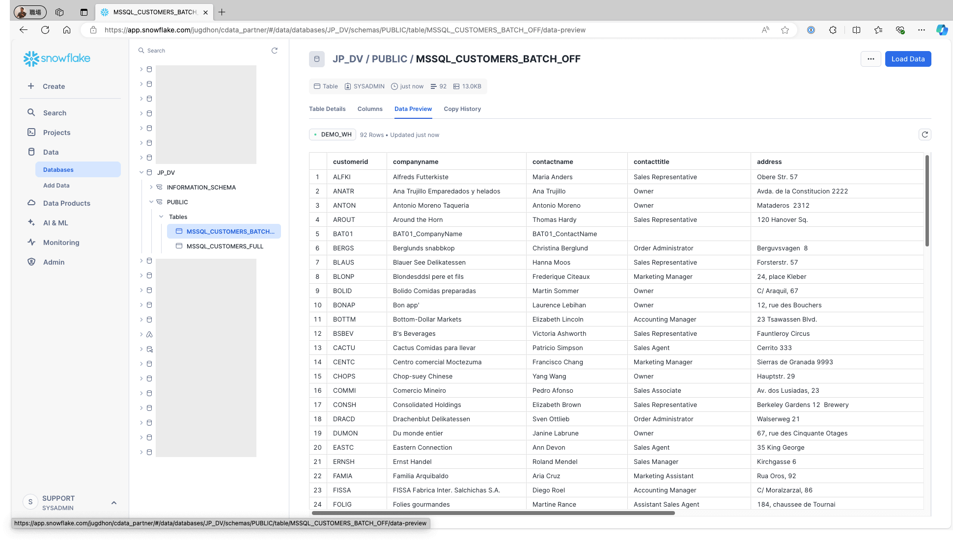 Access Snowflake and confirm that the data is stored in the respective tables: