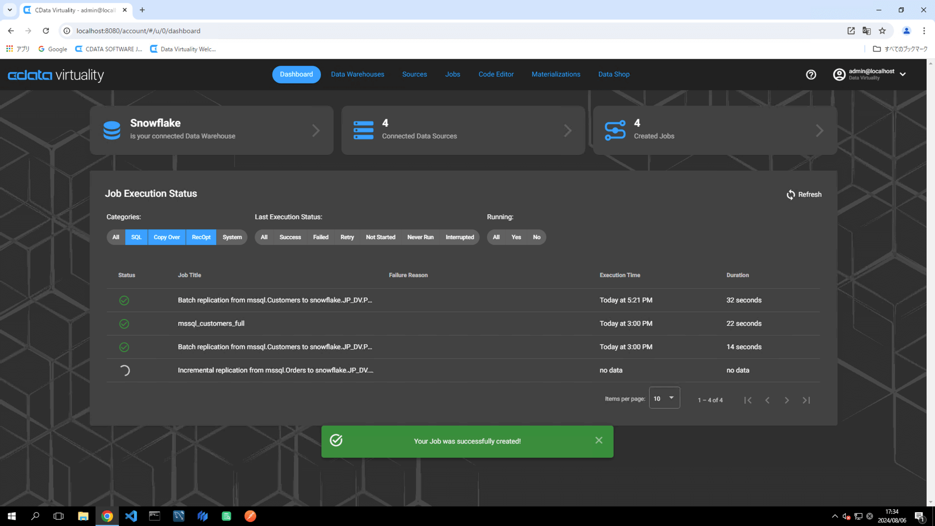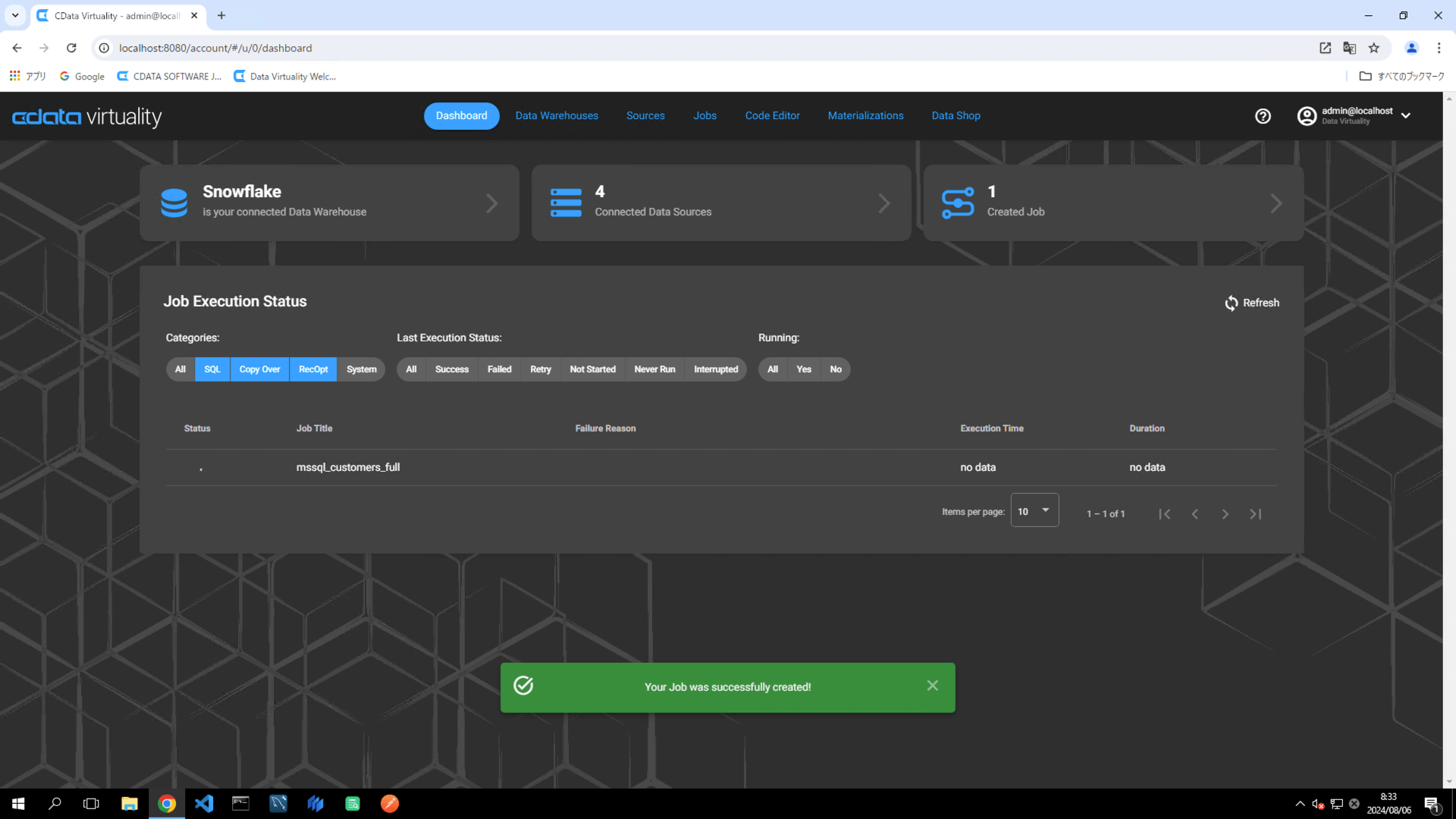 The Dashboard screen will open. The green bar will confirm that the job was created successfully: