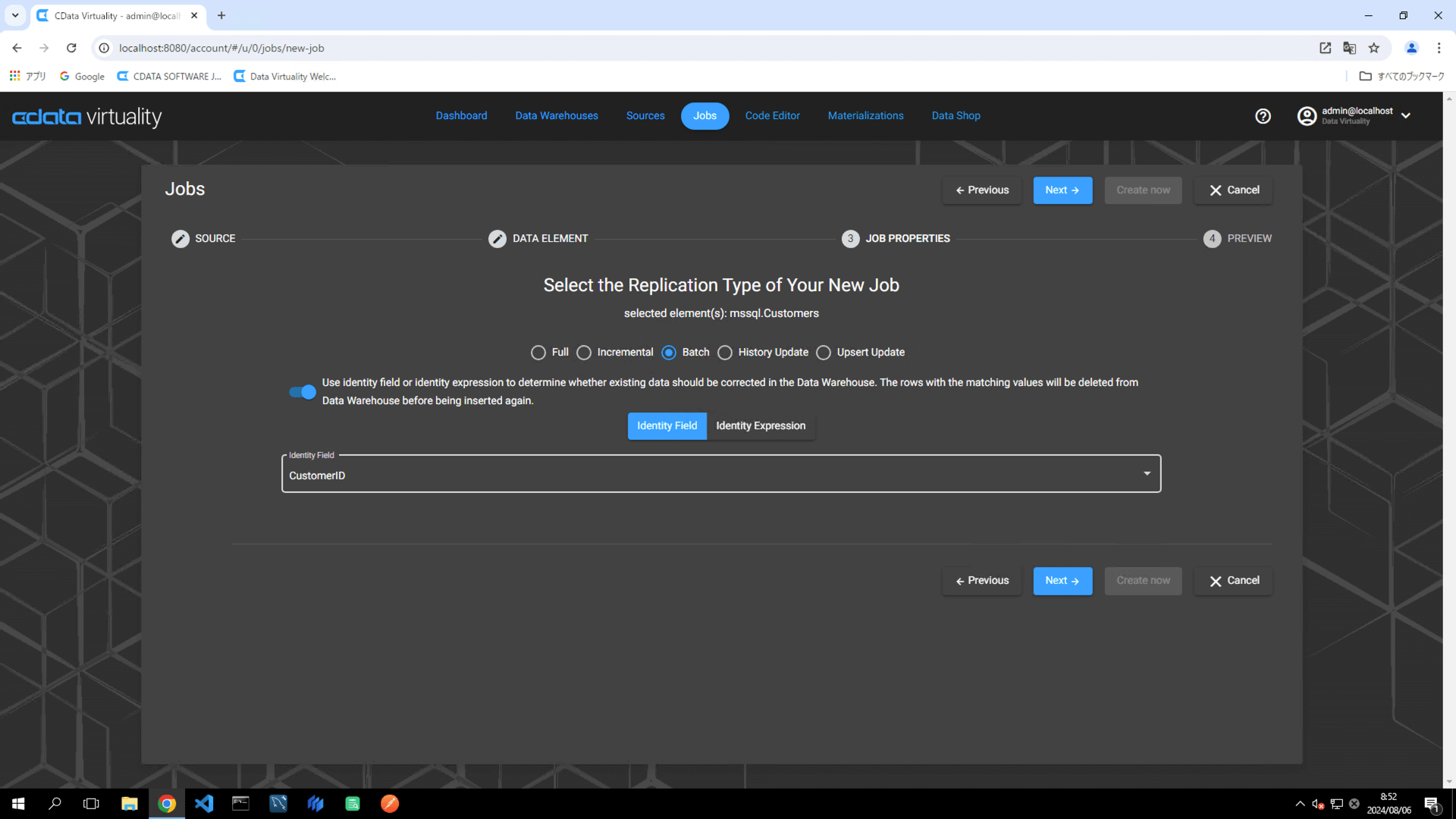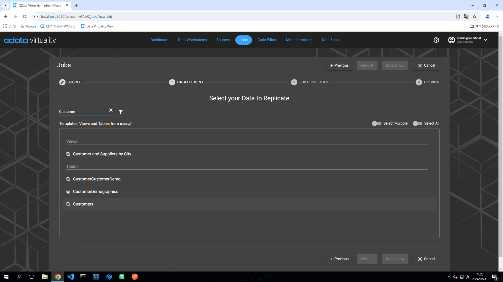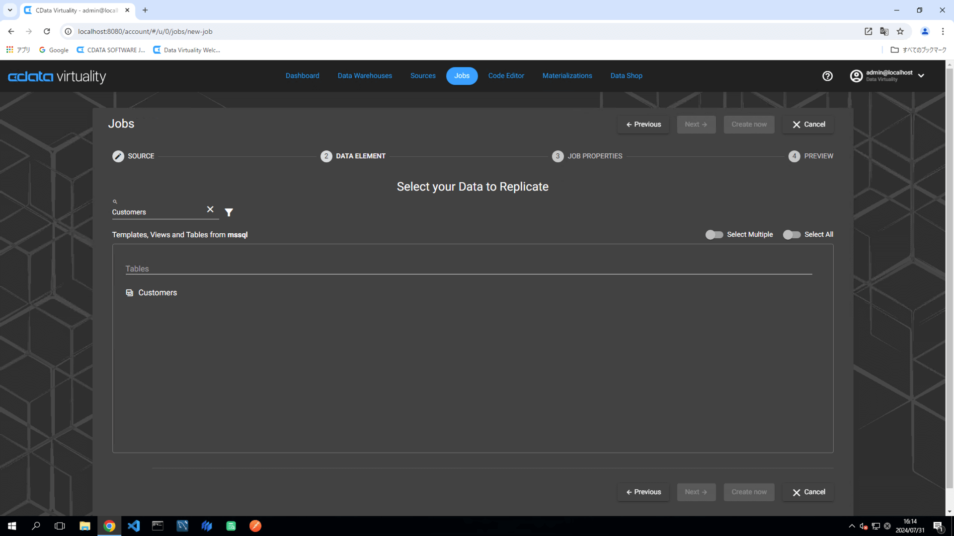 On the Create Job screen, select a table (e.g., the Customers table in Microsoft SQL Server).