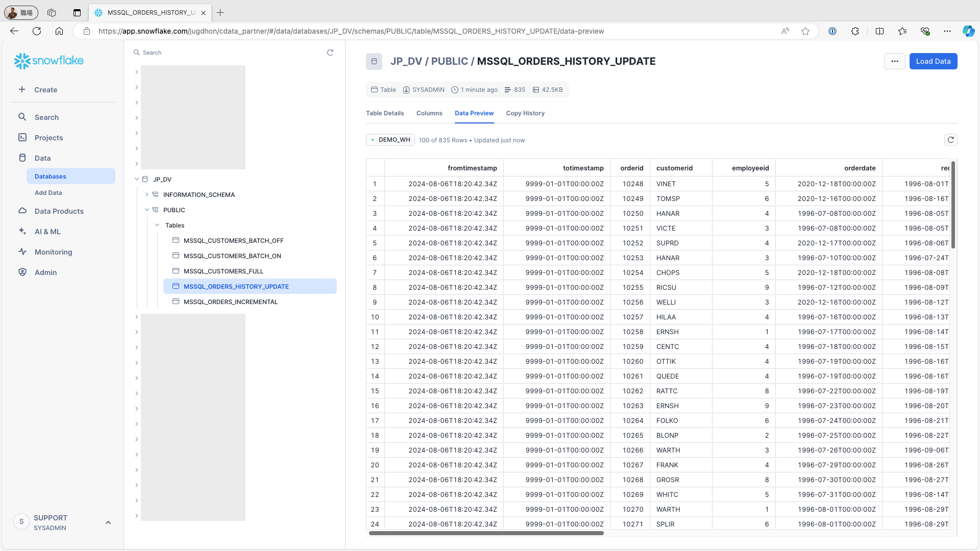 Access Snowflake and check the replication destination table. Confirm that the newly added and updated records from the data source are accurately reflected in the replication destination table, and ensure that the records are properly linked to the replication destination: