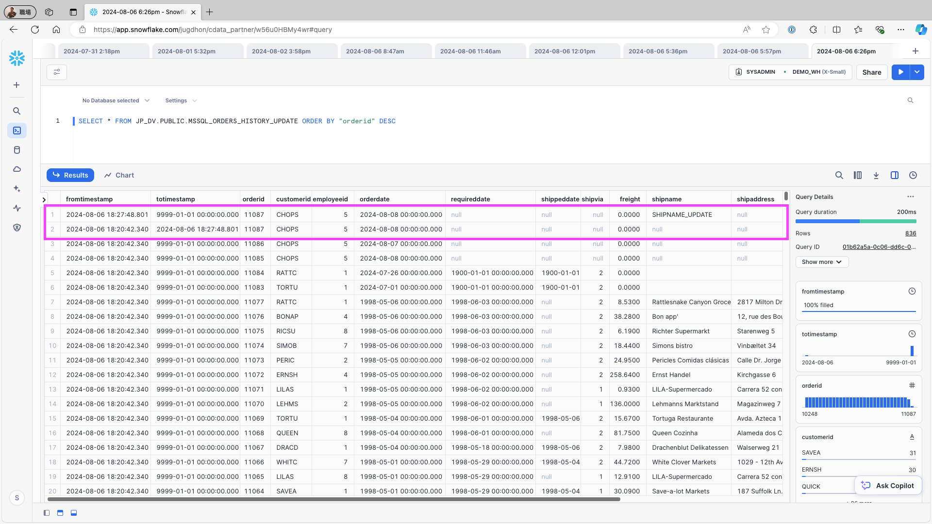 Access Snowflake and confirm that the fromtimestamp and totimestamp fields have been added to the table. Verify that the records are correctly stored: