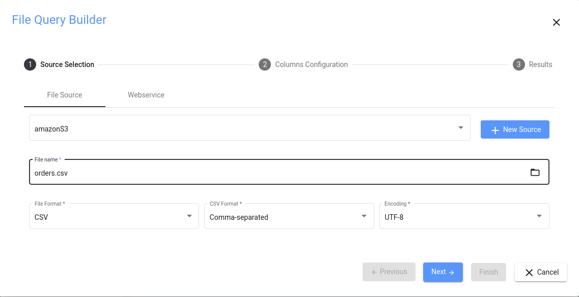 Select the File source tab and get your data from an accessible file in your file system. To use this, you must have a data source of type File connected and the appropriate right to read files in this directory.