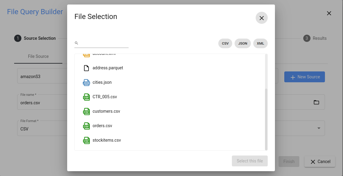 Start the query builder, as described earlier, from any open SQL editor tab by clicking on the icon showing a down arrow and selecting Open CSV query builder from the menu. Now you need to get the data. In our example, we assume to have a data source named filer, which points to a file system folder on the system where the CData Virtuality Server runs. After selecting the data source from the list, click on the folder icon and select the file you want to import. In this example, the selected file is forecast_canonical.csv ( forecast.xml ) and contains some weather information.