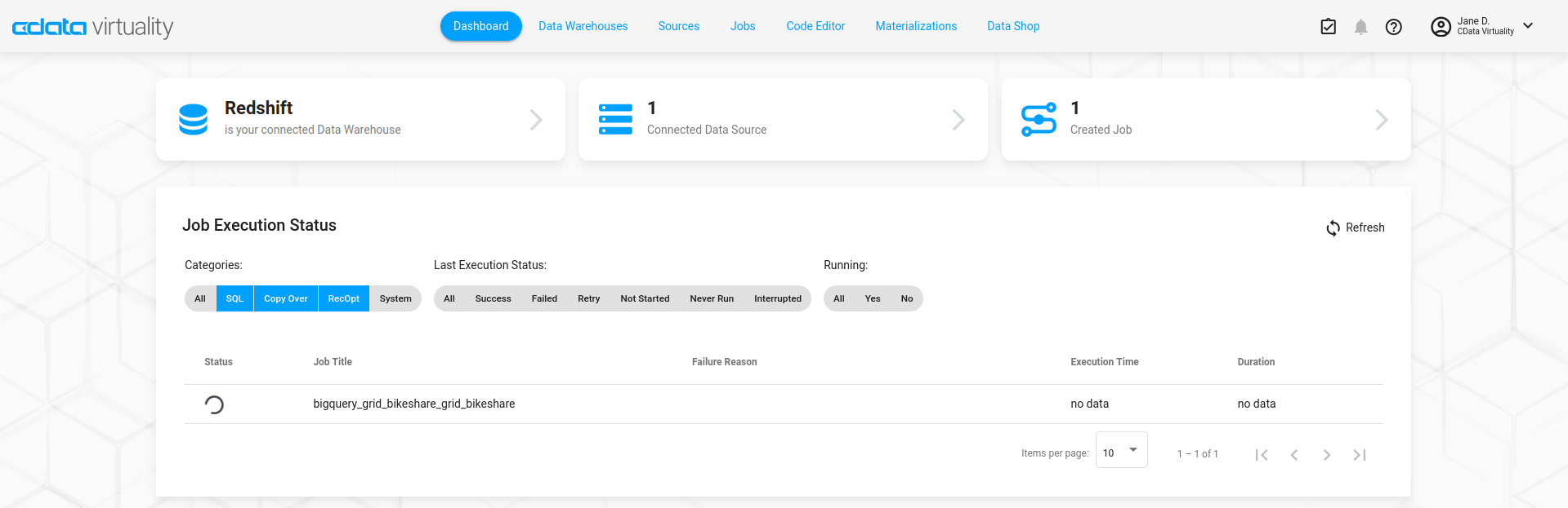 All runs for the past 24 hours are recorded in the log below. The default number of items per page is 10, but it can be changed to 50 or 100. You can select jobs to be displayed according to their category, last execution status, and status - all buttons are clickable.