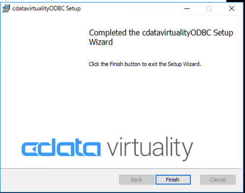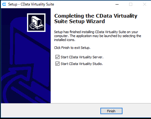 Once the installations of the CData Virtuality Server and ODBC Drivers are complete, the checkbox Start CData Virtuality Server and Studio will be selected by default. Click the Finish button to exit the set-up wizard and launch the application: