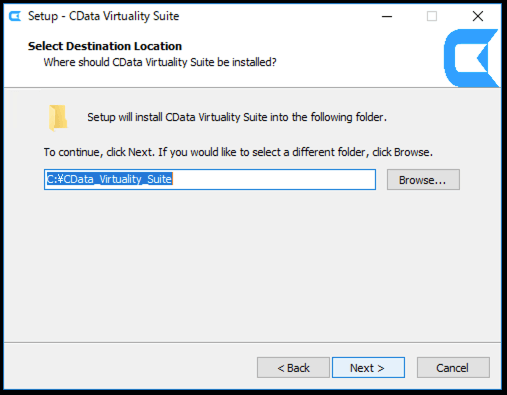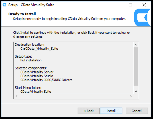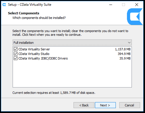 This guide will proceed with the default full installation, which includes CData Virtuality Studio, CData Virtuality Server, and JDBC/ODBC Drivers. Follow the steps provided in the wizard to complete the set-up of the CData Virtuality Server: