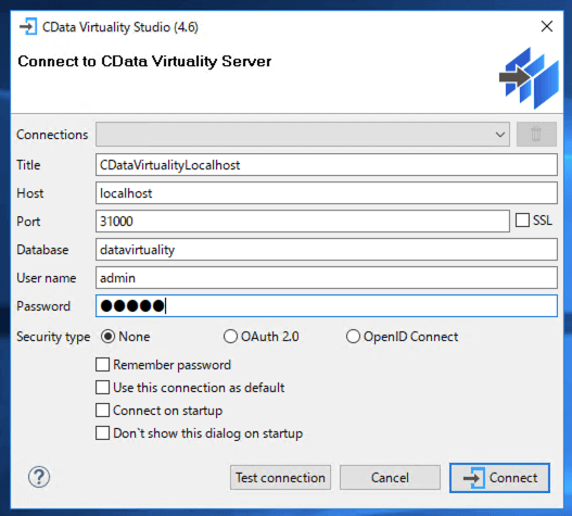 In the Connect to CData Virtuality Server window, configure the following settings and click the Test connection button: