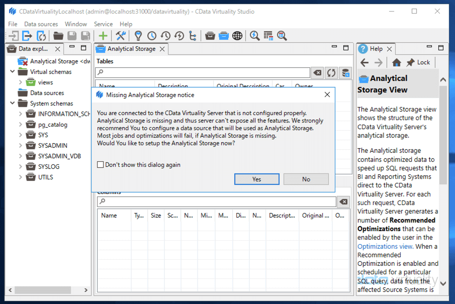 CData Virtuality Studio will launch and display a notice indicating that the Analytical Storage was not found: