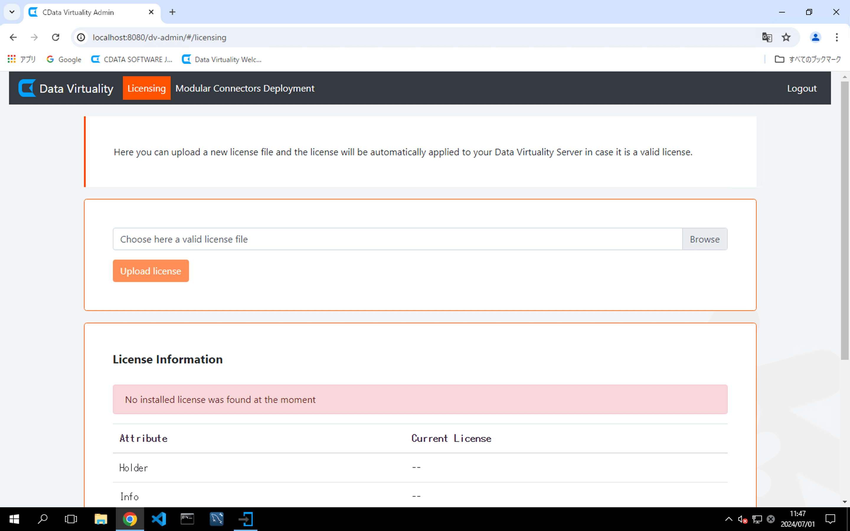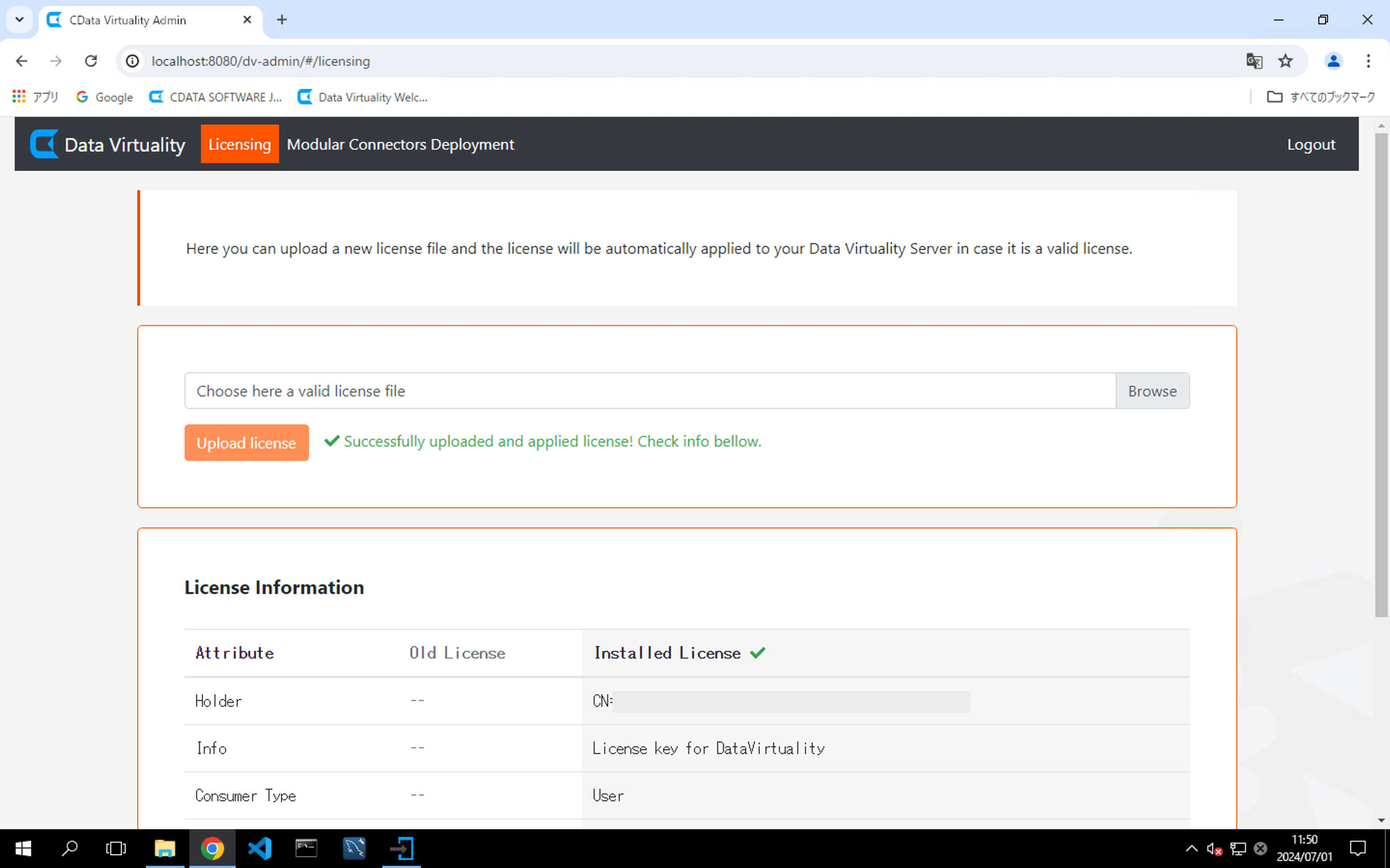 If the license is successfully verified, the message Successfully uploaded and applied license! Check info bellow will appear. Detailed license information will then be displayed under the License Information section. To exit CDATA VIRTUALITY ADMIN, click the Logout button located in the upper right corner of the screen: