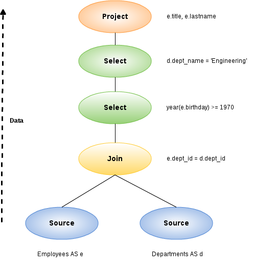 Data flows from the tables at the bottom upwards through the join, select, and finally, the project to produce the final results. The data passed between each node is logically a result set with columns and rows.
