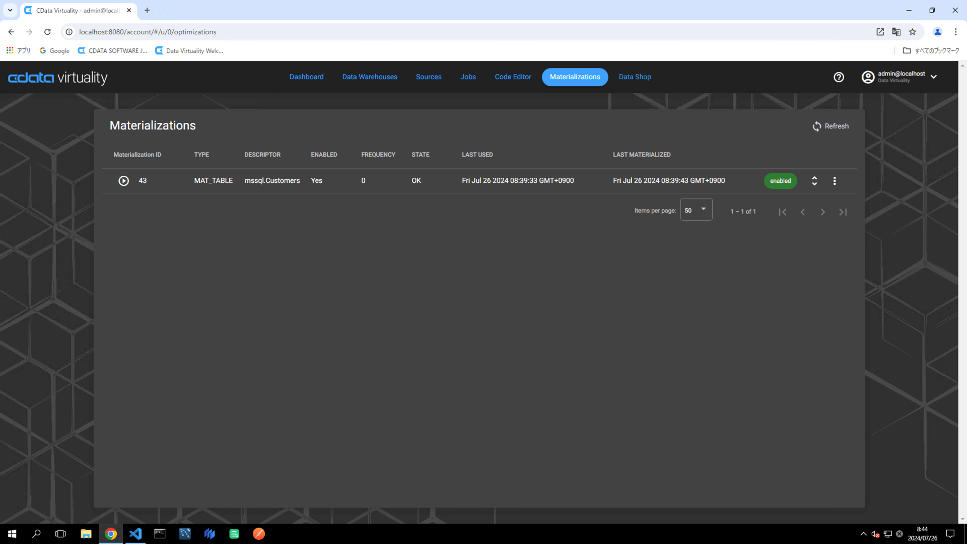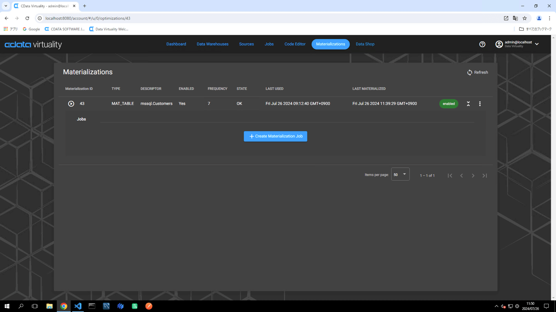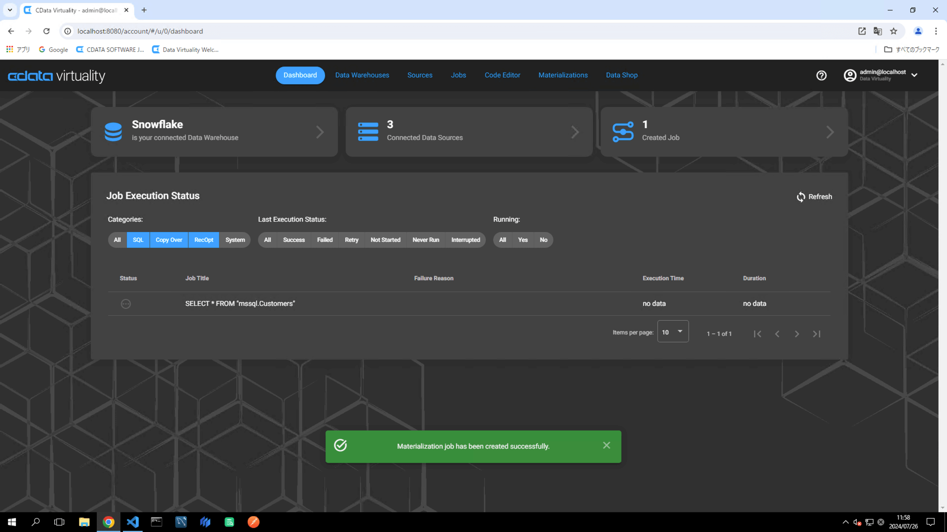 Verify that the Dashboard screen opens and displays the newly added materialization job: