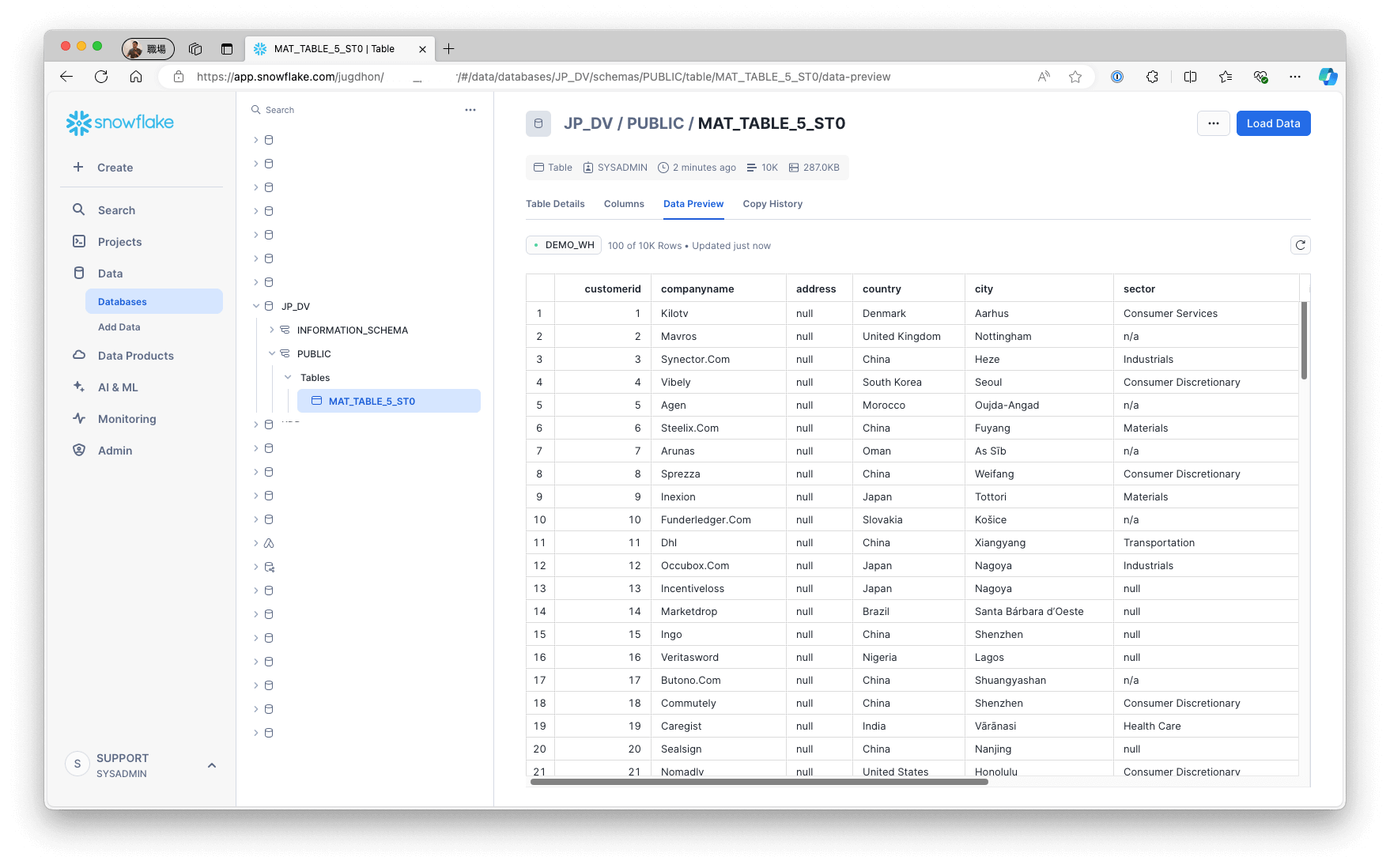 A materialized table is created in the analytical storage with a name like MAT_TABLE_5_ST0. To preview the materialized table and verify that it contains the data, access the analytical storage: