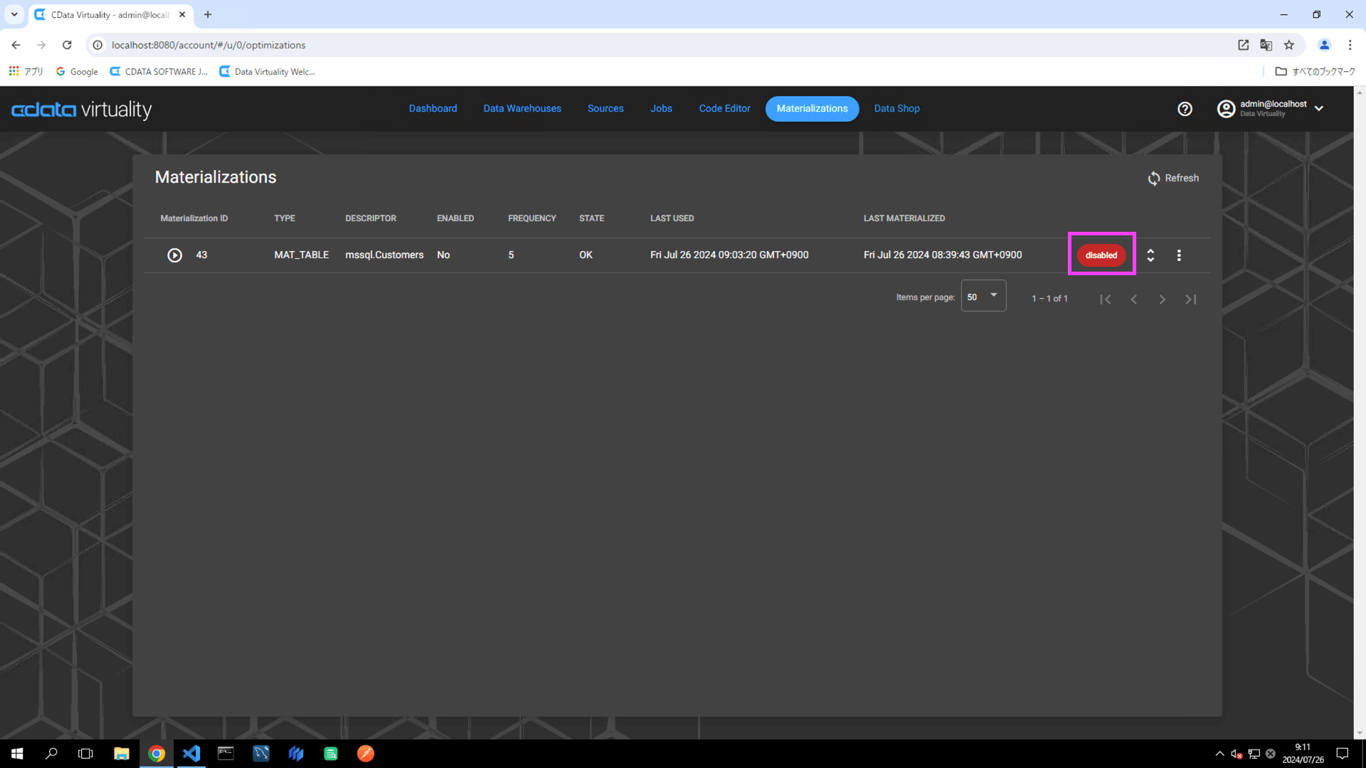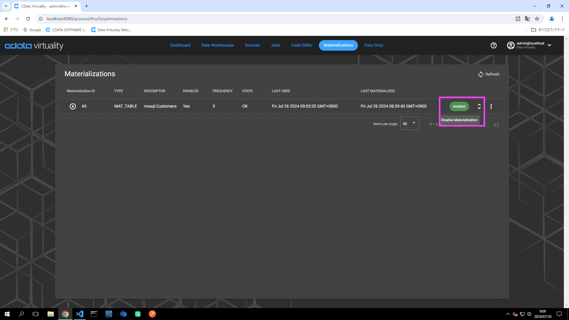 In the Materializations list, locate the target record. Click the Enable button to the right of the record to switch the status to Disable Materialization: