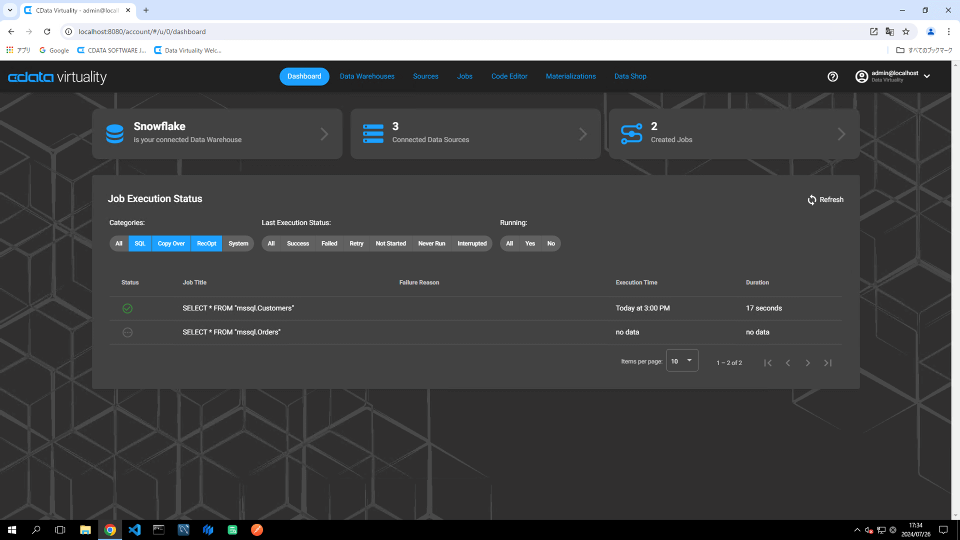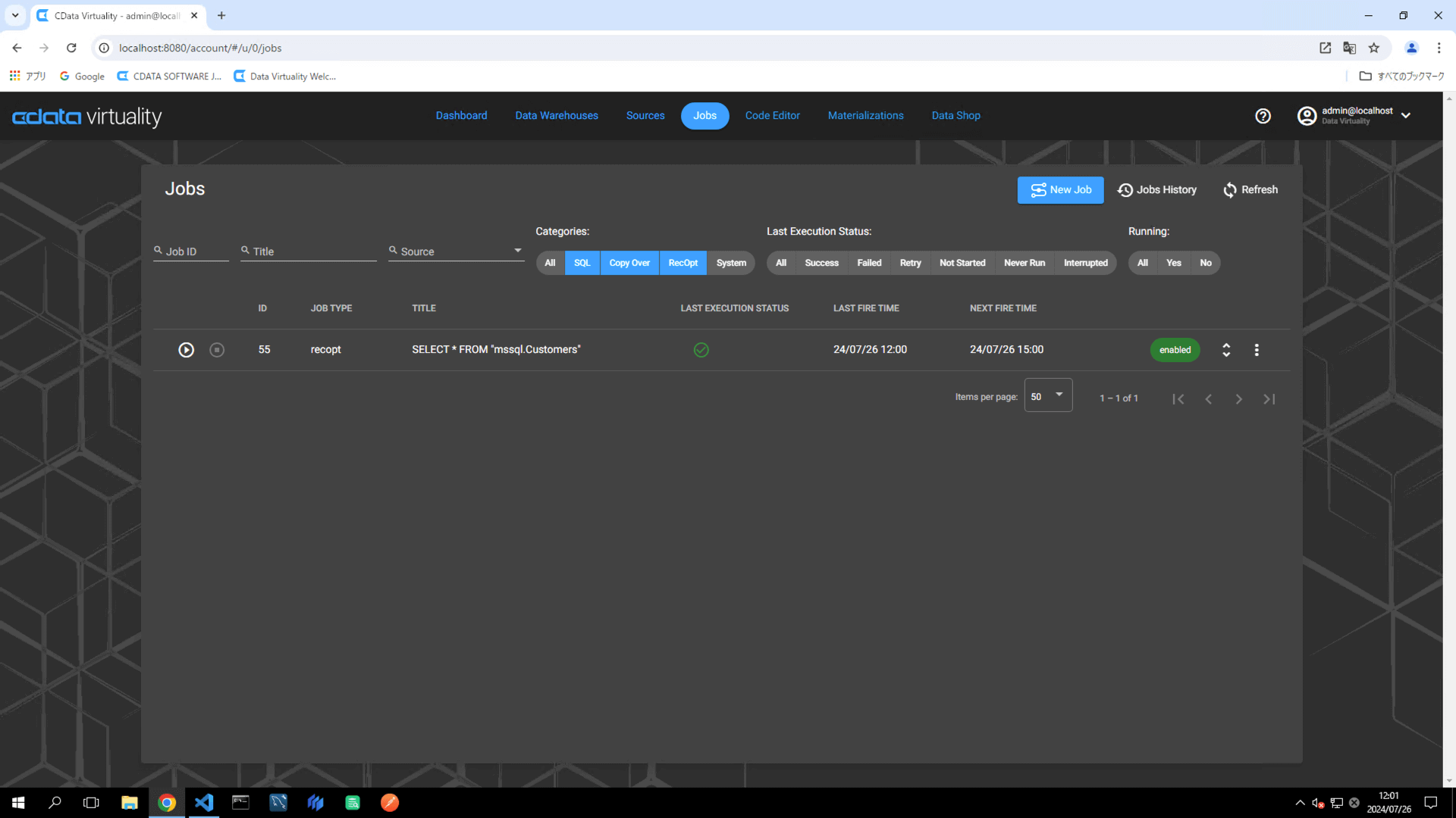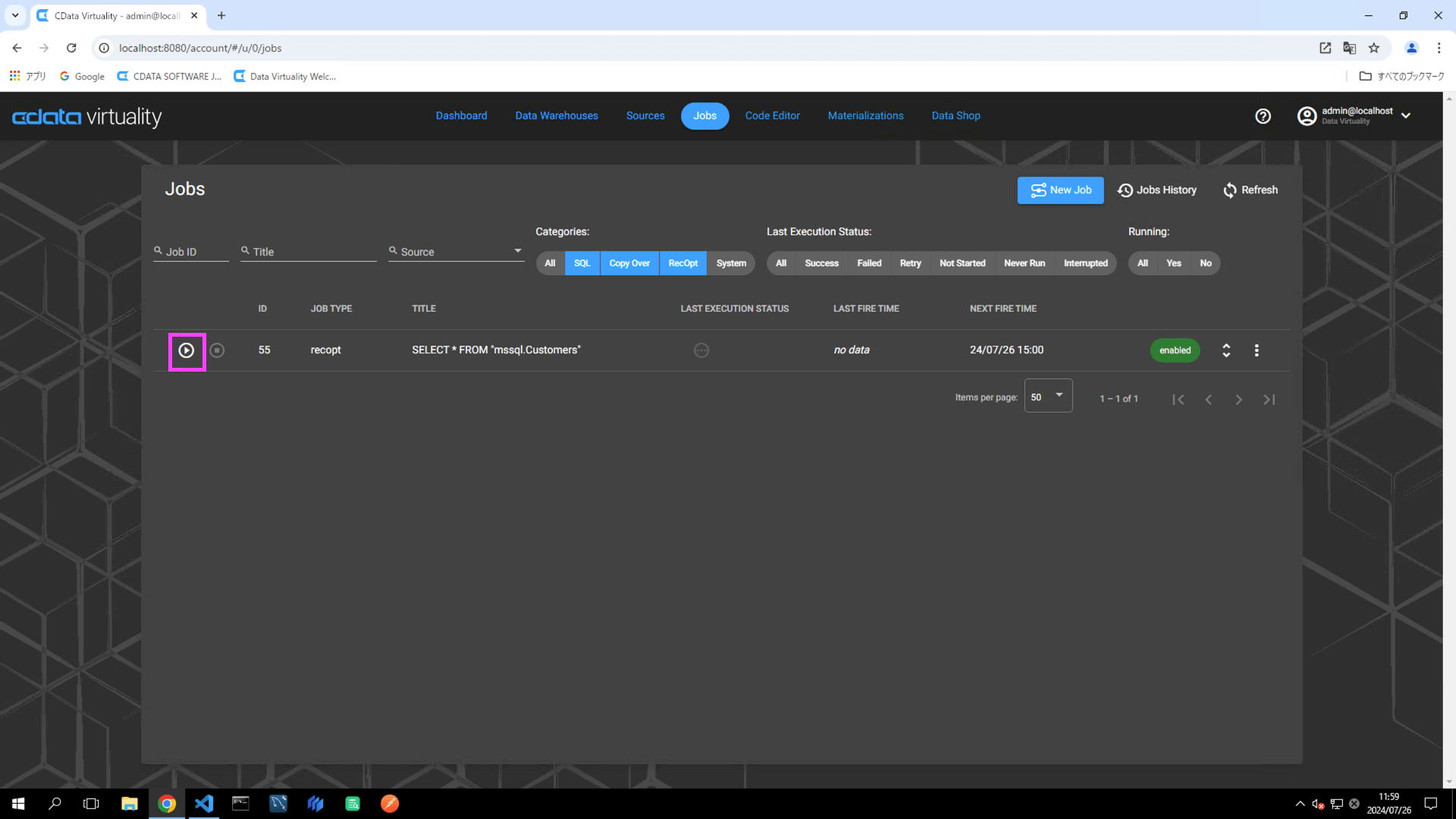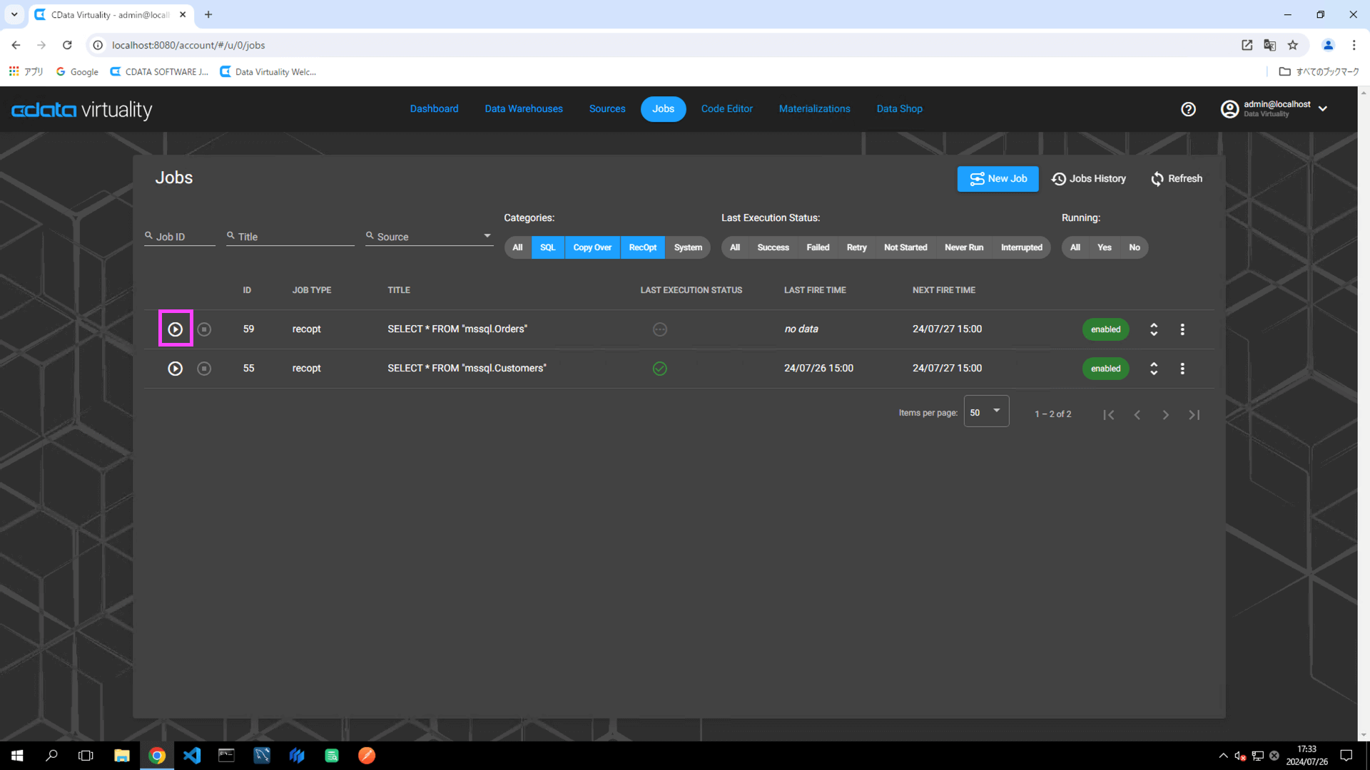 Return to the CData Virtuality Web UI, open the Jobs screen, locate the created job, and click the Run Job Now icon to manually execute the job: