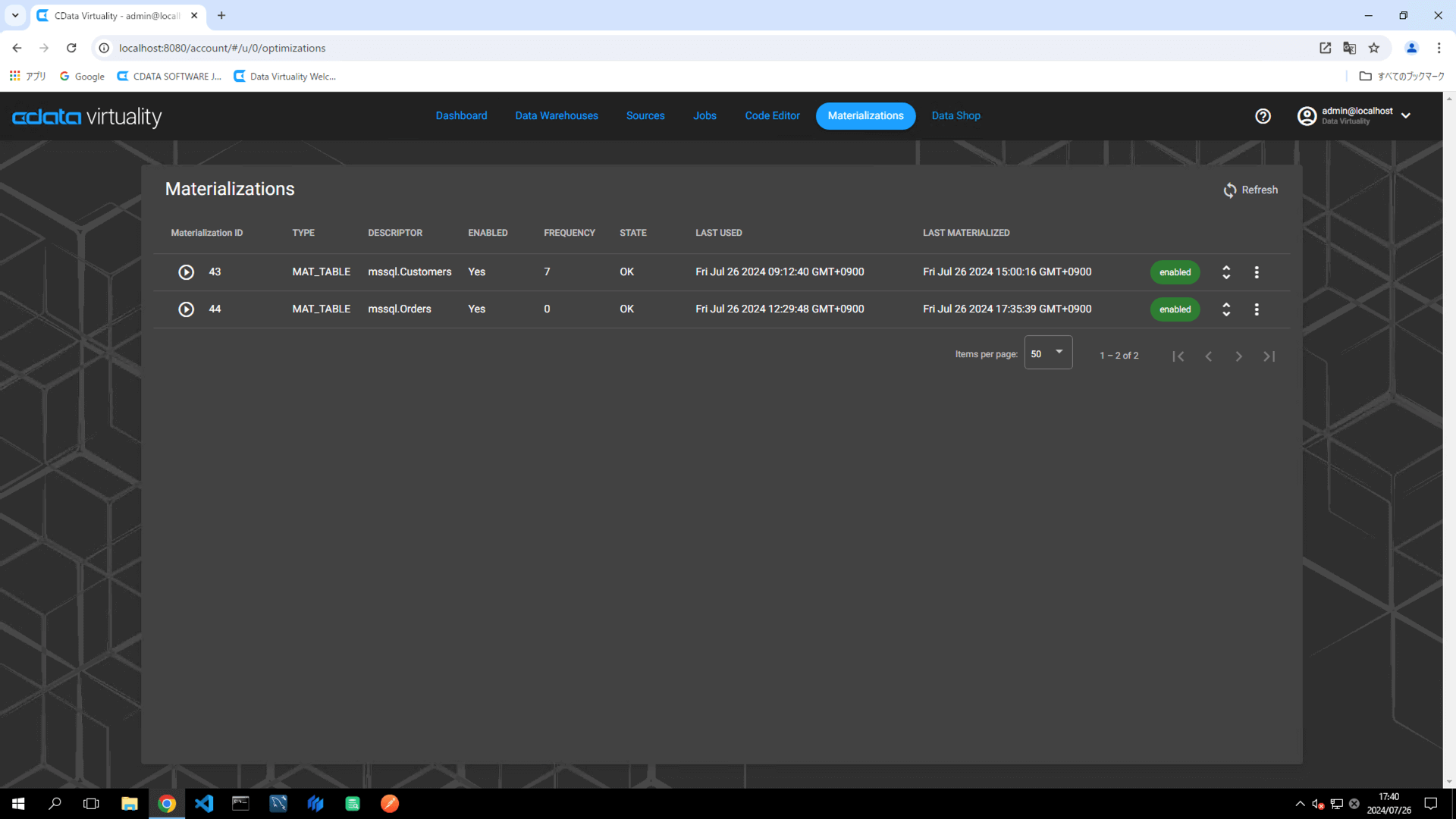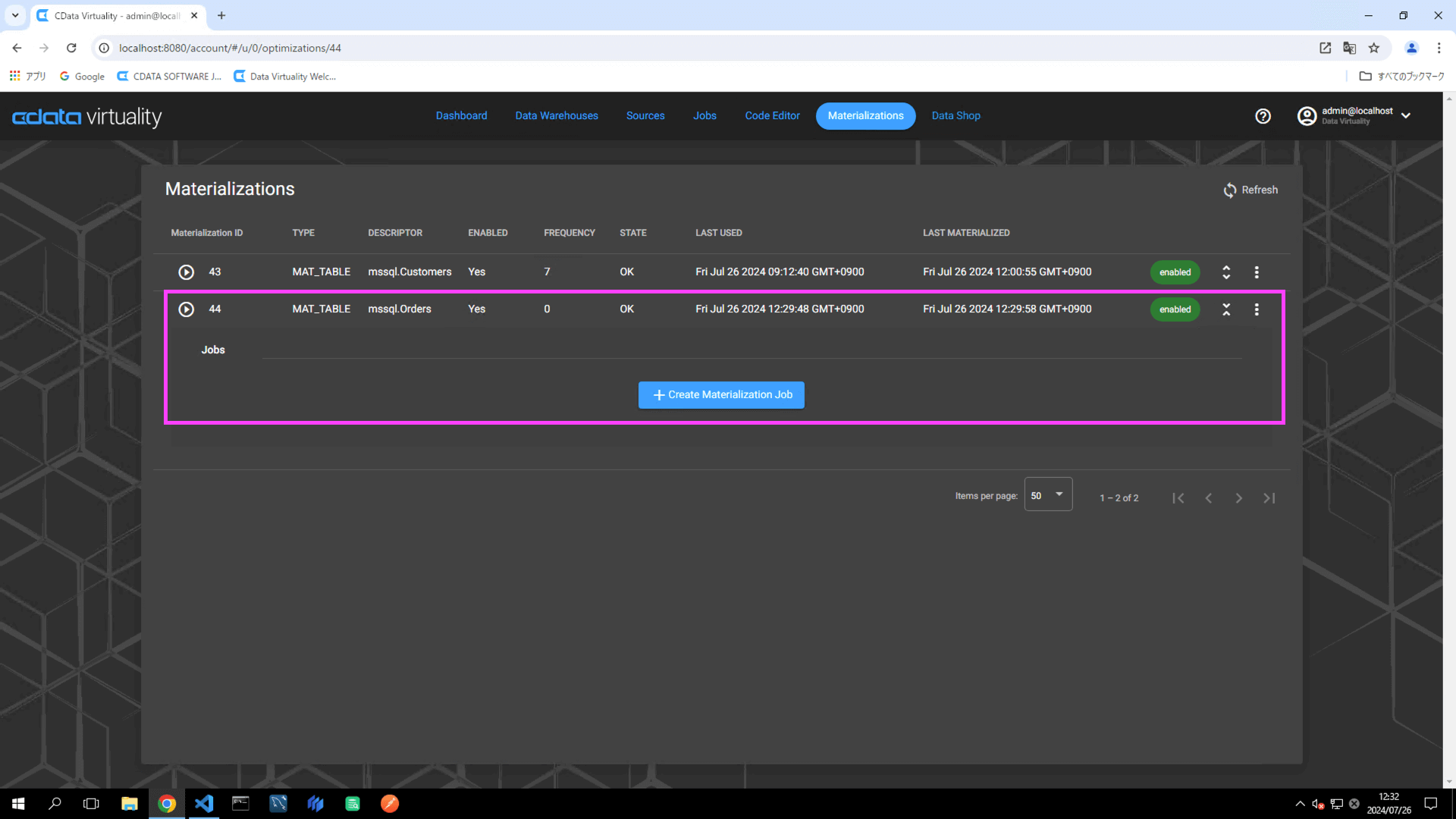 Navigate to the Materializations screen, and confirm that materialization for the created job is set to enabled: