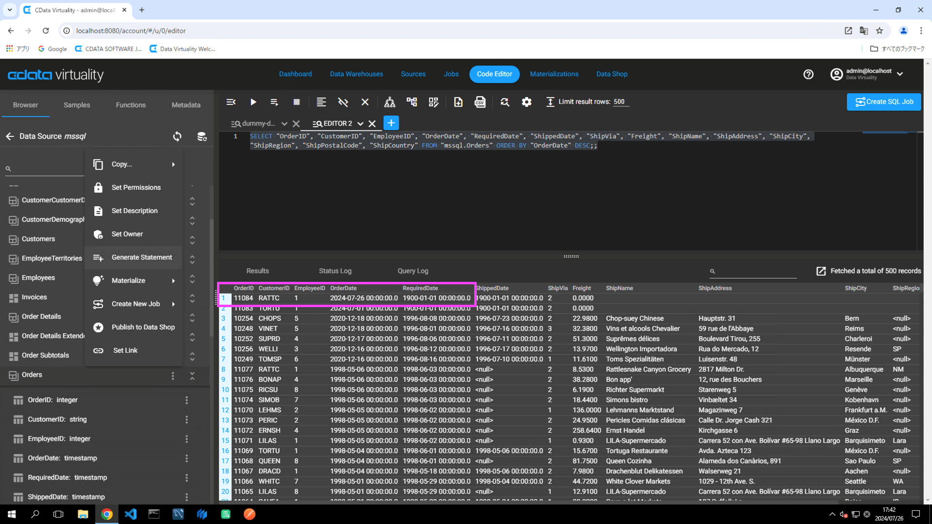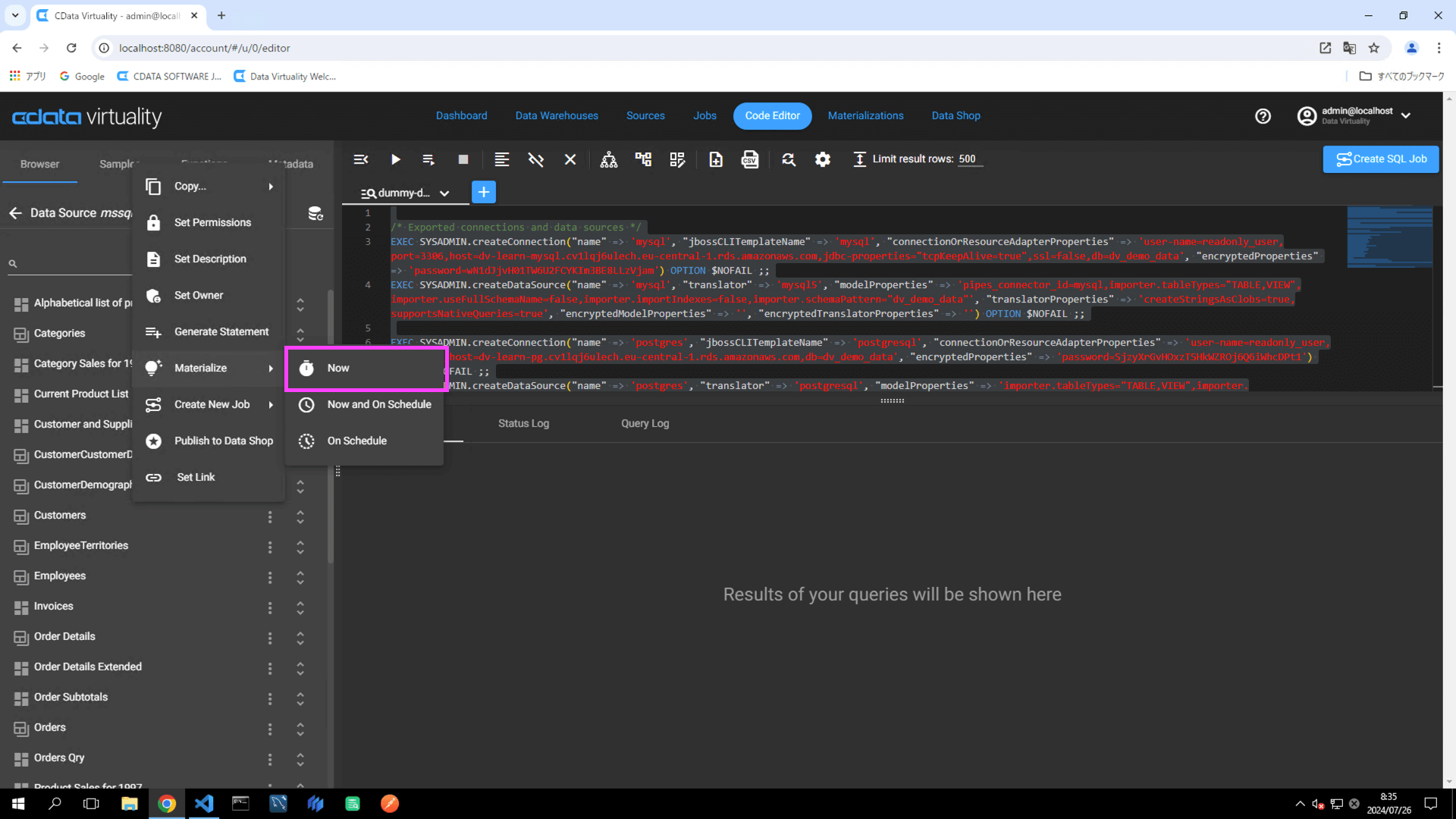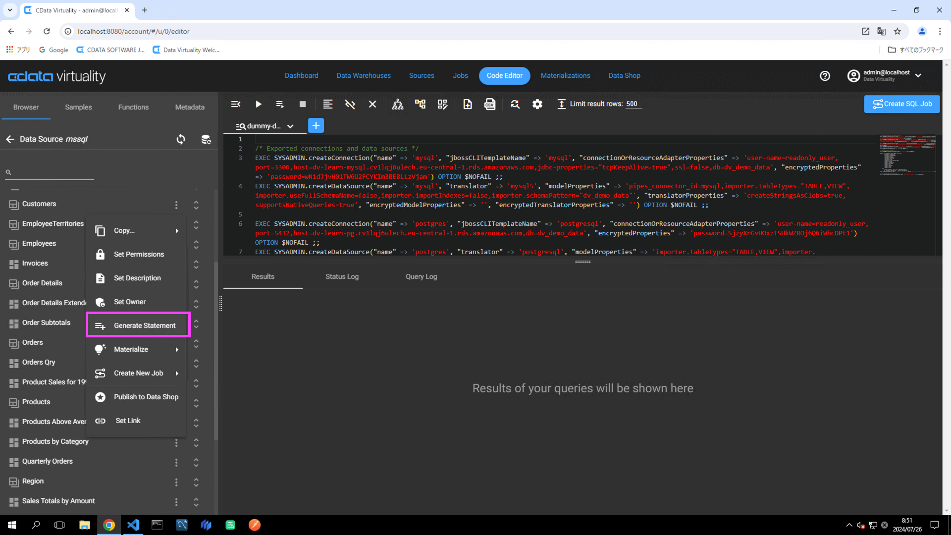 Navigate to the Code Editor tab. Click the Browser tab -> Microsoft SQL Server Data Source (labelled as mssql in this example) -> Materialize, and locate a table (e.g., Customers). Click the three vertical dots and select Generate Statement from the context menu: