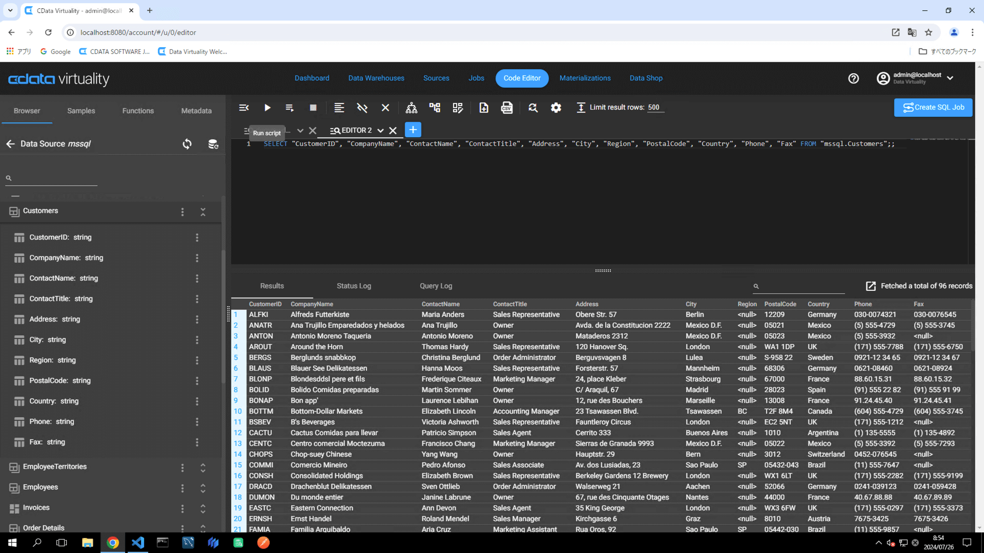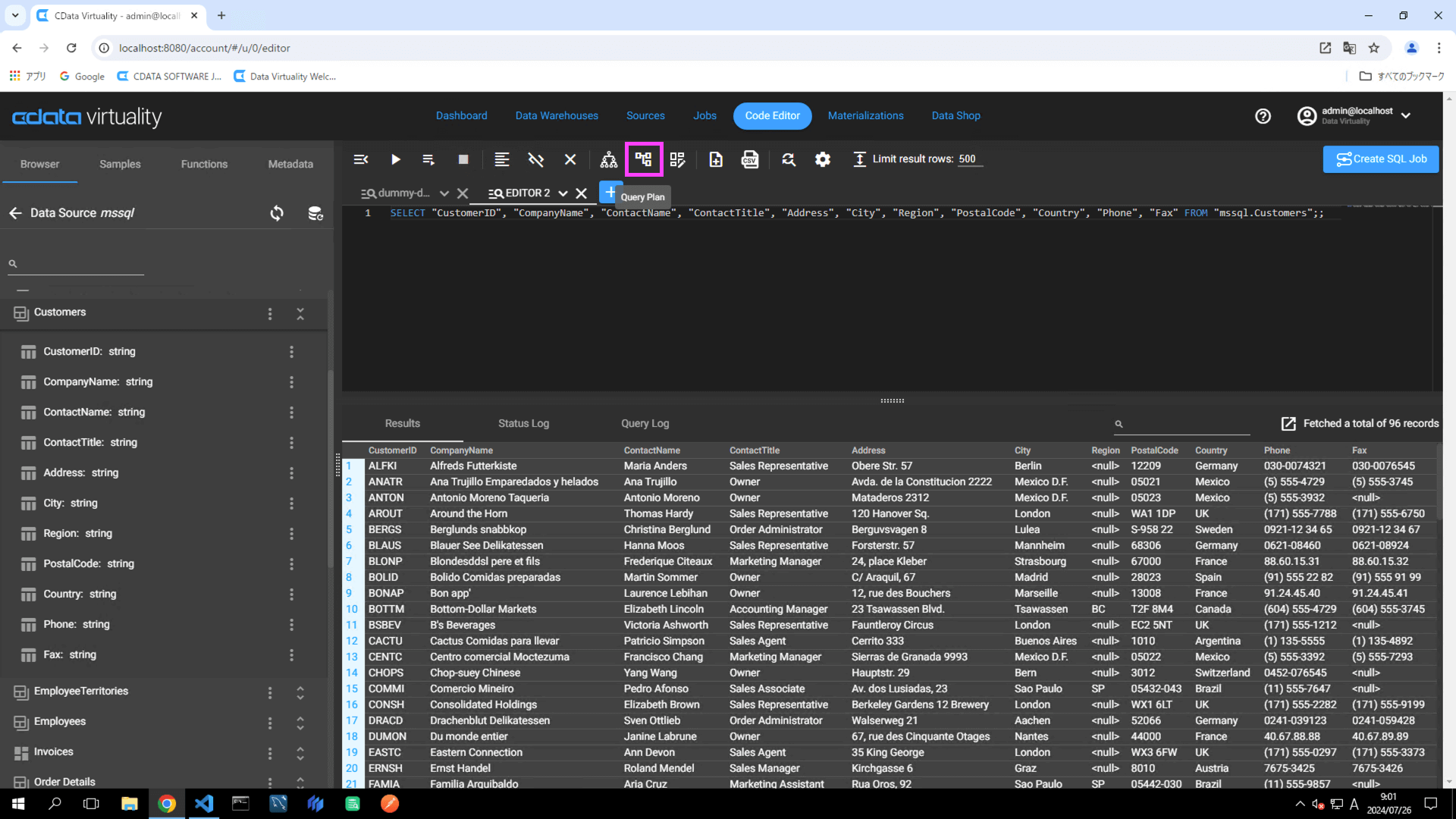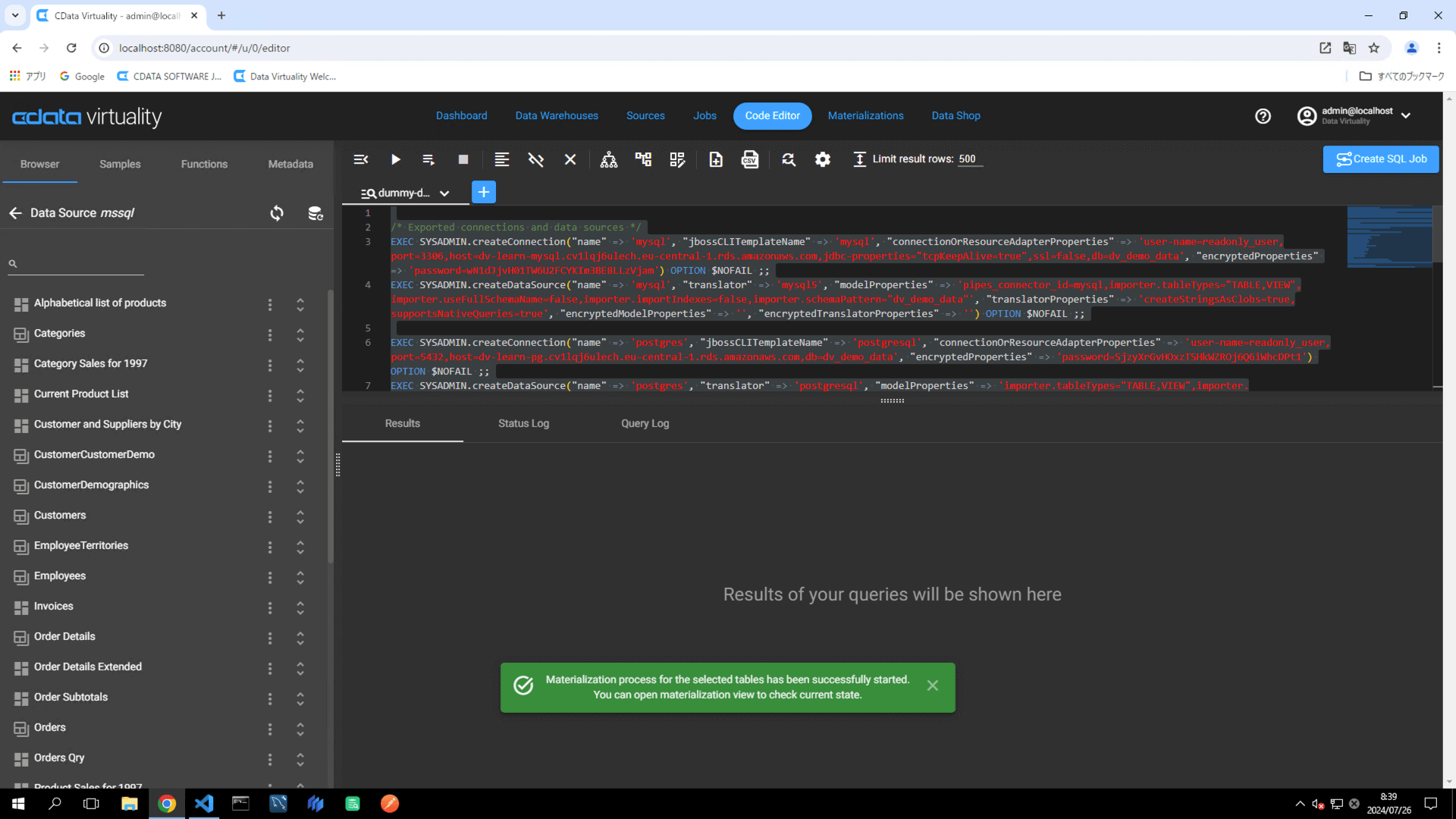 Navigate to the Code Editor tab. Click the Browser tab -> Microsoft SQL Server Data Source (labelled as mssql in this example) -> Materialize, and locate a table (e.g., Customers). Click the three vertical dots and select Generate Statement from the context menu: