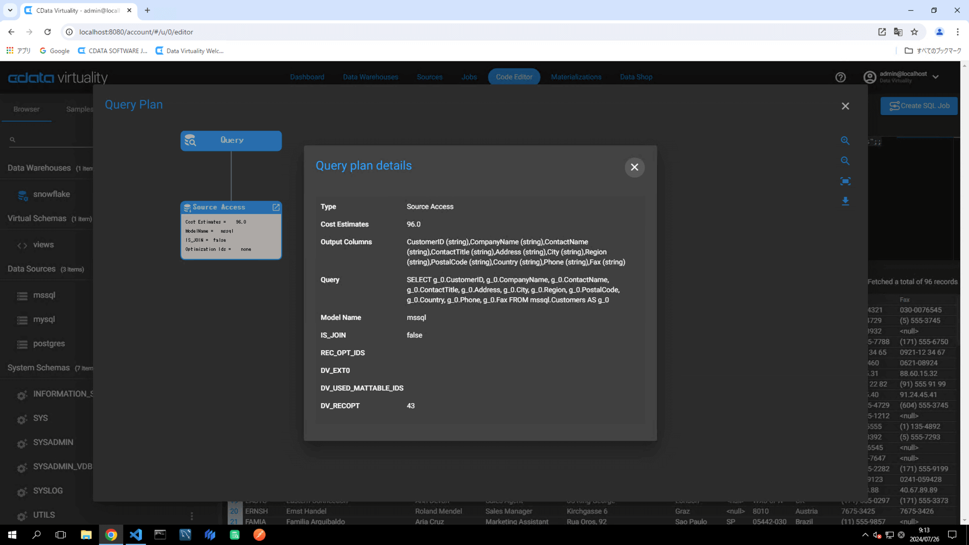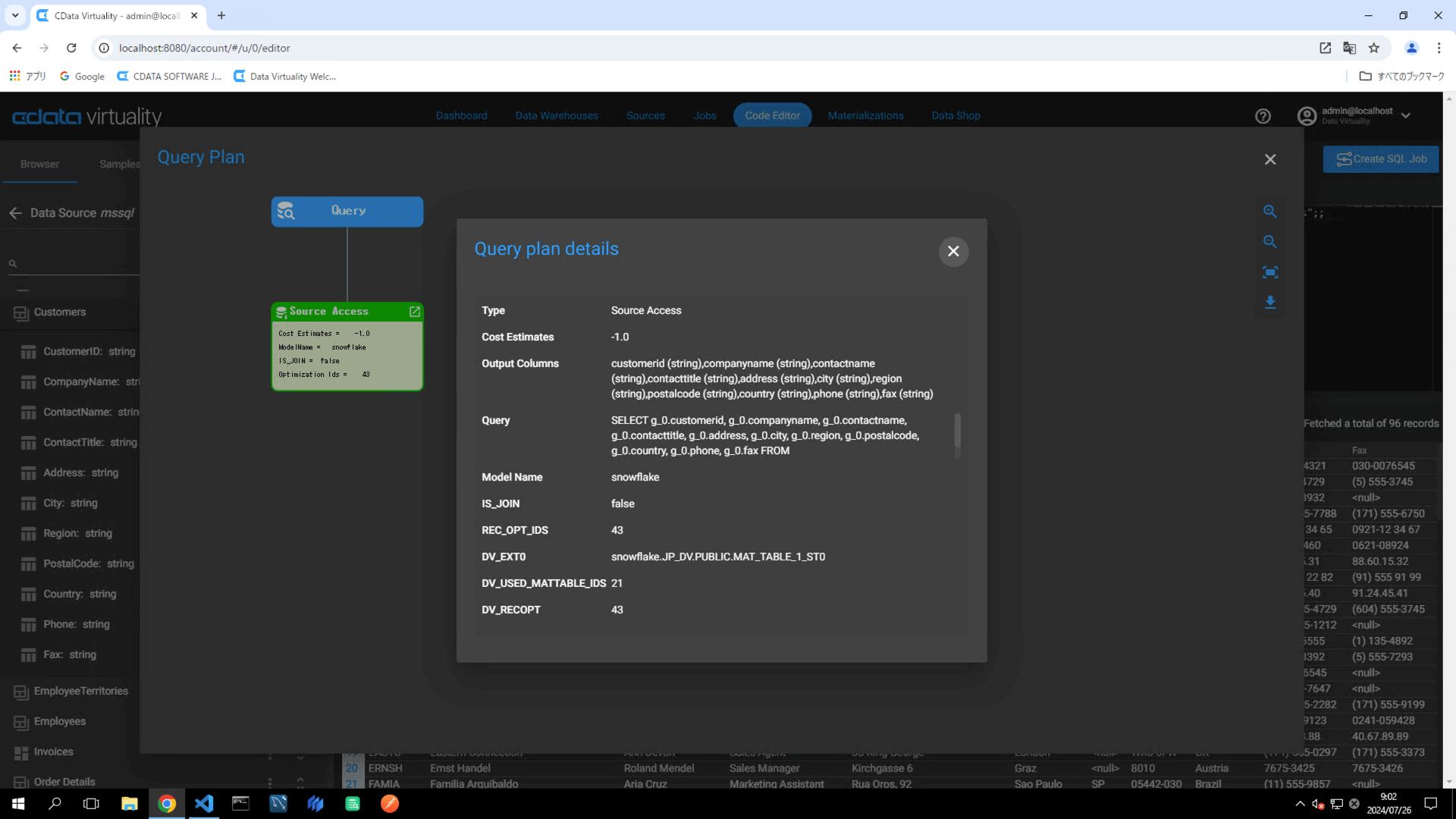 The Query Plan window will open, displaying the execution plan of the query. A green color in the Source Access indicates that the query is retrieving data from a materialized table. The Query plan details specify which materialized table in analytical storage is being used to retrieve the data:
