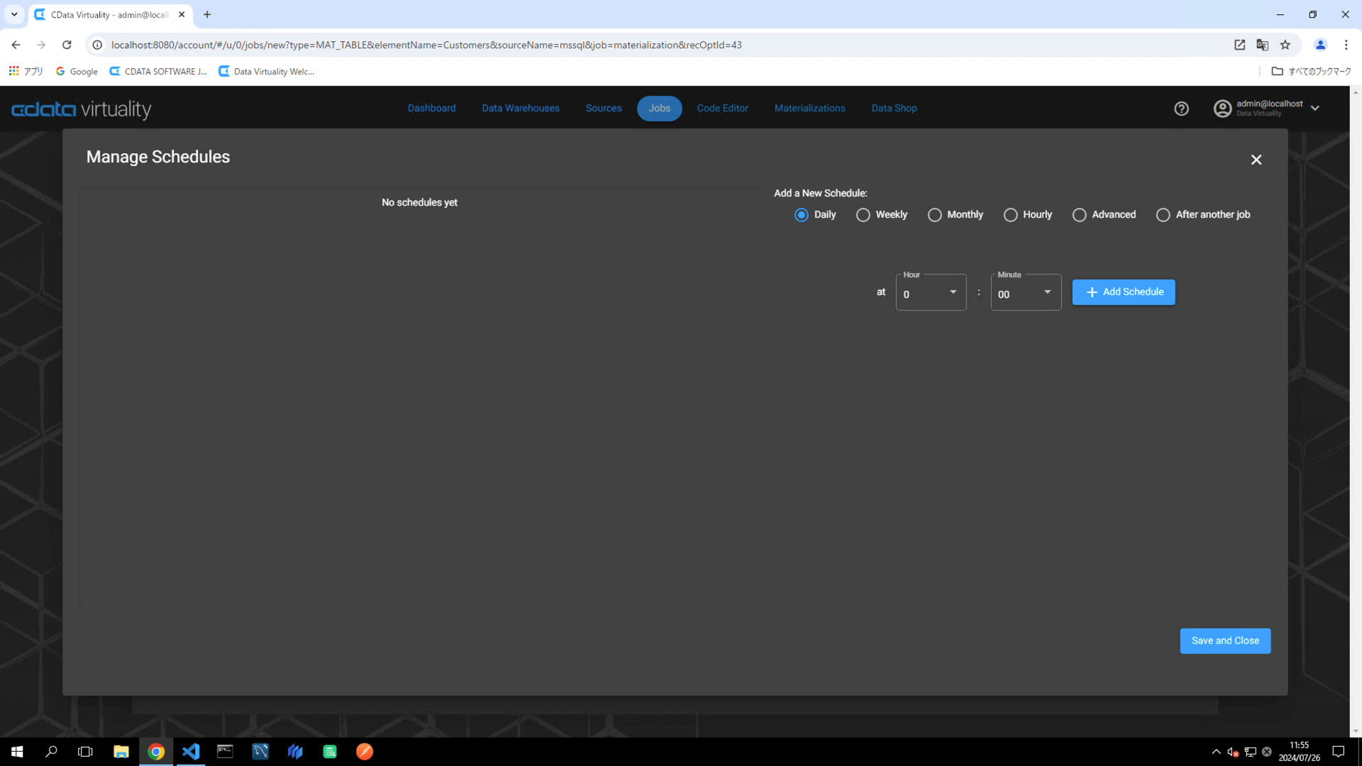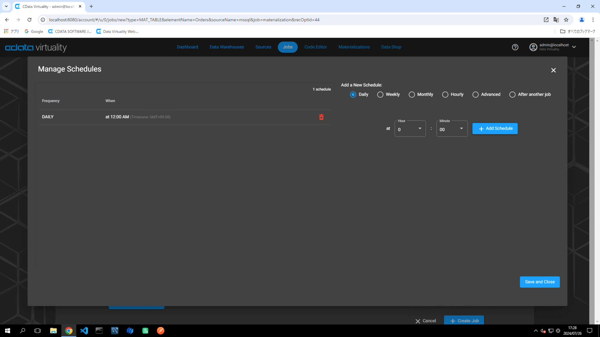 When the Manage Schedules screen opens, click the +Add Schedule button. Configure the job execution schedule by specifying the desired frequency and timing. Click the Save and Close button to save the schedule:
