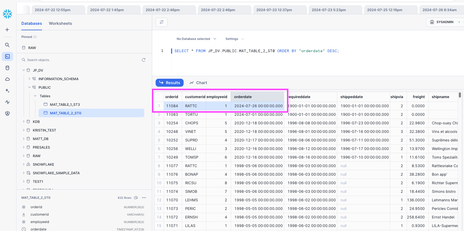 SELECT "OrderID", "CustomerID", "EmployeeID", "OrderDate", "RequiredDate", "ShippedDate", "ShipVia", "Freight", "ShipName", "ShipAddress", " ShipCity", "ShipRegion", "ShipPostalCode", "ShipCountry" FROM "mssql.Orders" ORDER BY "OrderDate" DESC;;